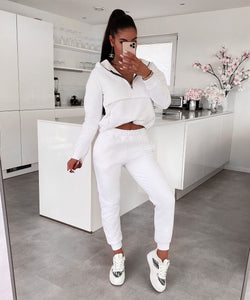 Our soft, lined jogger set is exclusively available from us. Turns out normal. Sweater can be adjusted. Model wears size XS for a closer fit, her normal size S would also fit great. She is 1.65m tall.