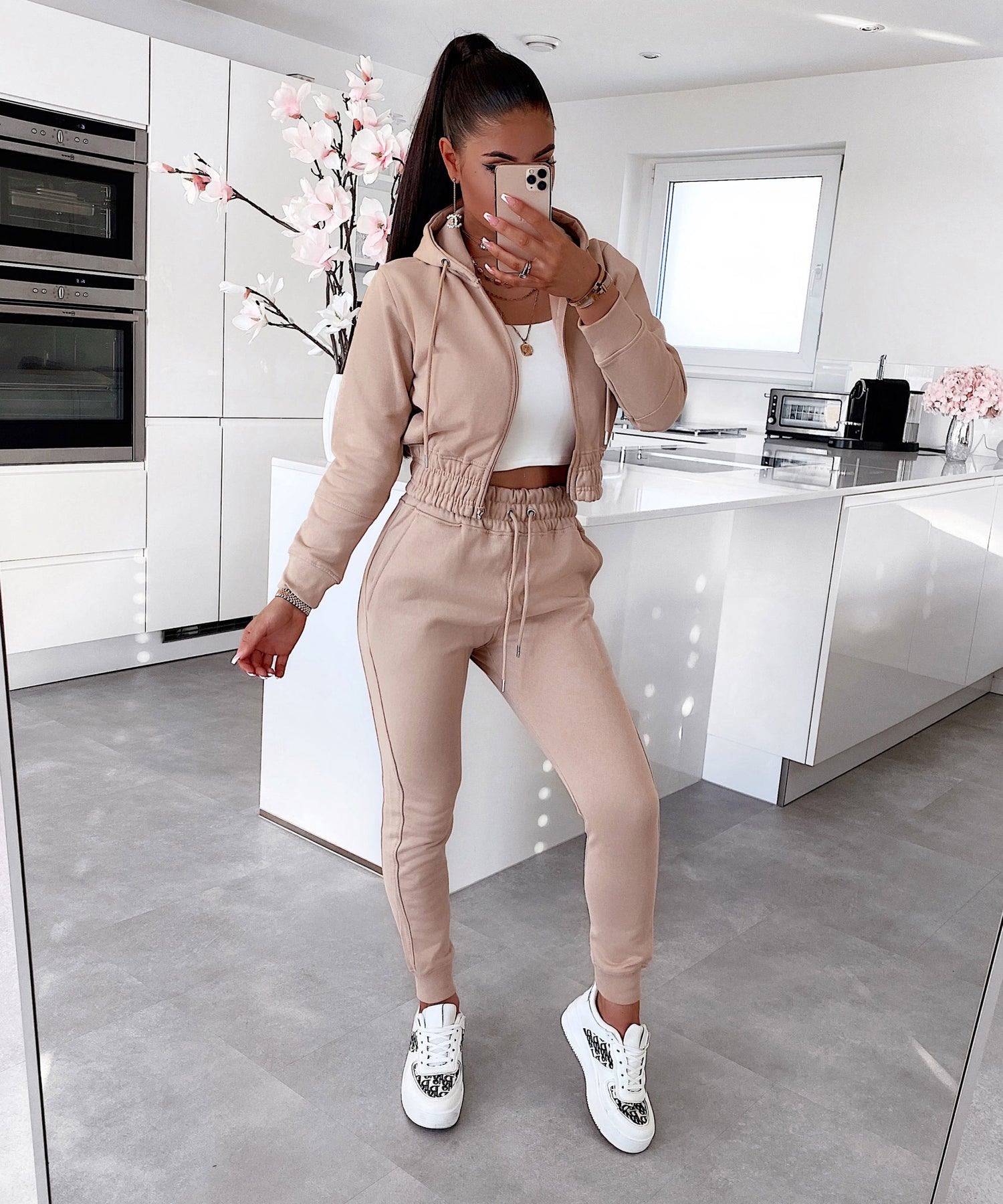 Padded jogger set. For a slim fit (as in the picture) order your normal size, for a looser fit order one size larger. Model wears XS for a closer fit. S would also fit her. Due to the special cut at the buttocks, it has a push-up effect. Available exclusively from us.