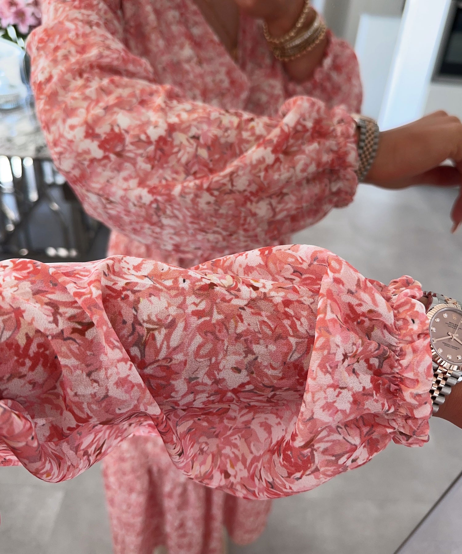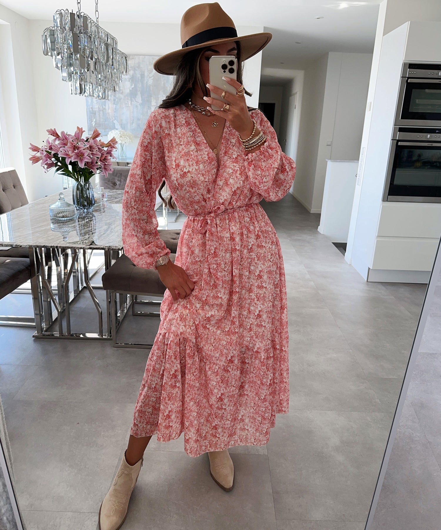 Super schönes Maxi Kleid mit Blumenmuster und Bindegürtel zum Taillieren. Model ist 1,65m groß. Gesamtlänge: ca. 127cm