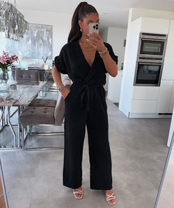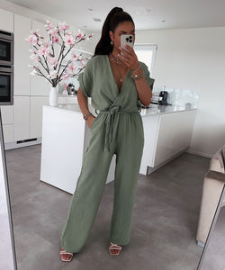 Beautiful muslin one-piece suit made from 100% cotton with pockets and stretchy waistband. One size fits sizes XS-L. Model is 1.65m tall.