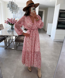 Super schönes Maxi Kleid mit Blumenmuster und Bindegürtel zum Taillieren. Model ist 1,65m groß. Gesamtlänge: ca. 127cm