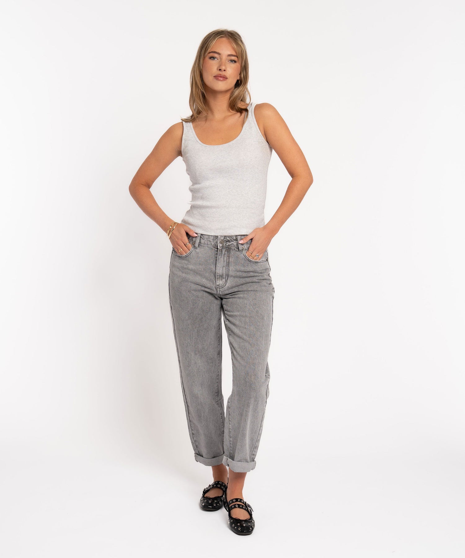Jeans aus Baumwolle mit Stretch. Fällt normal aus. Model eins ist 1,65m und trägt Größe S.