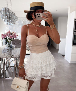 Fällt normal aus. Sehr dehnbarer Stoff. Unten zum öffnen. Verstellbare Träger. Model ist 1,65m groß und trägt Größe SM.