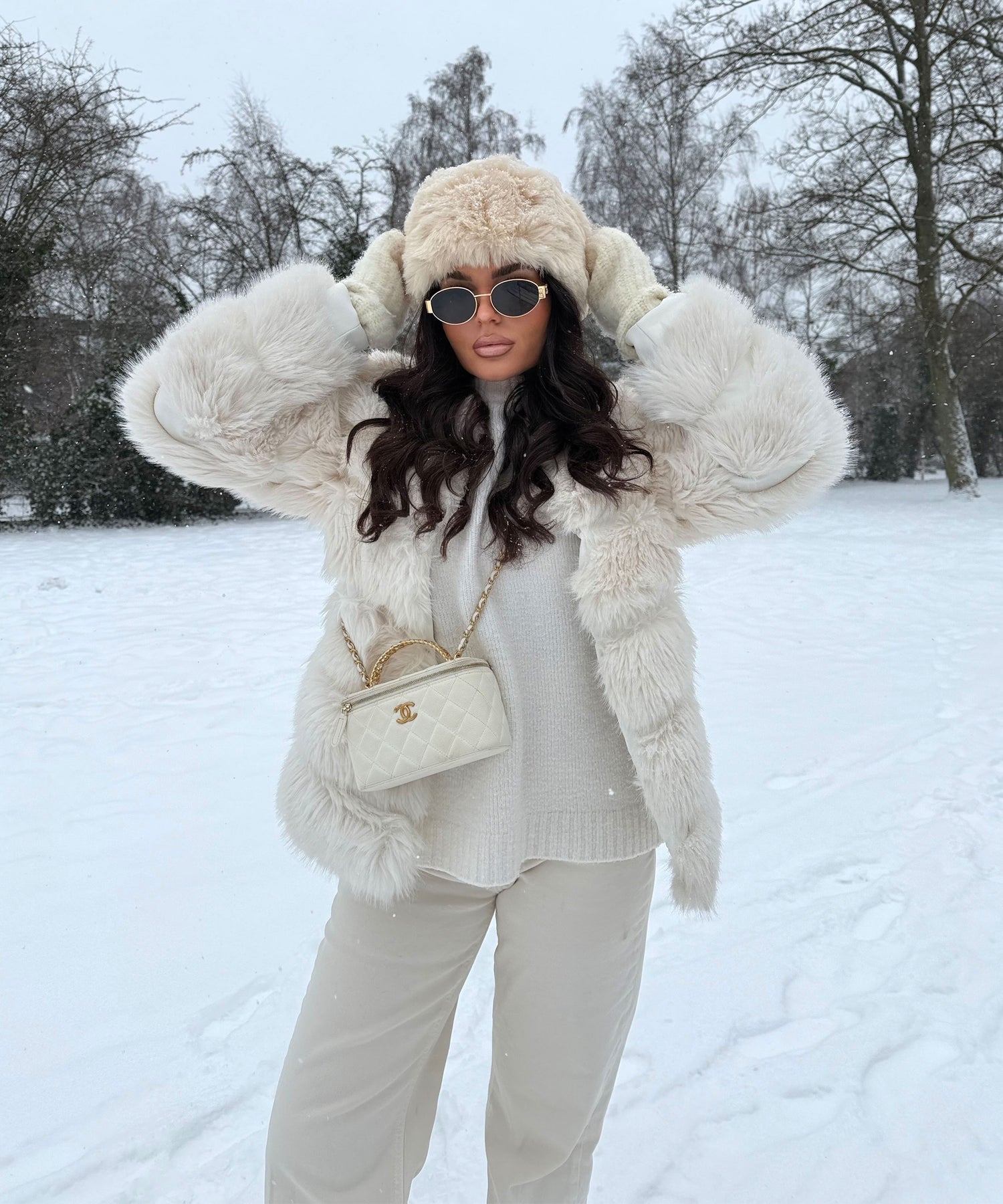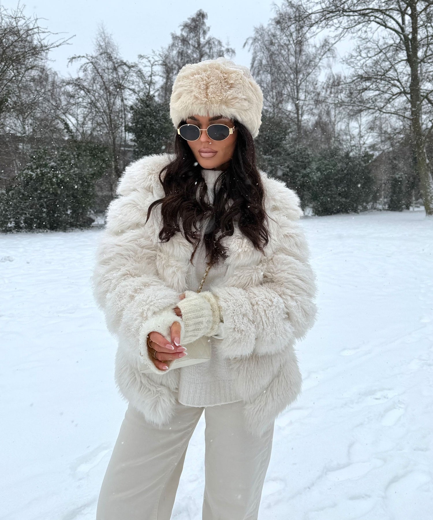 Fällt normal aus. Model ist 1,65m groß und trägt Größe SM. Da es Kunstfell ist und einzeln angebracht wurde verliert sie anfangs etwas an Fell. Einfach mit einer Bürste stark hin und her bürsten dann sollten alle losen Haare entfernt sein.