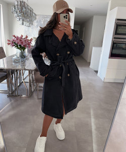 Super schöner Jeans Trenchcoat mit Gürtel zum Binden. Model ist 1,65m groß.