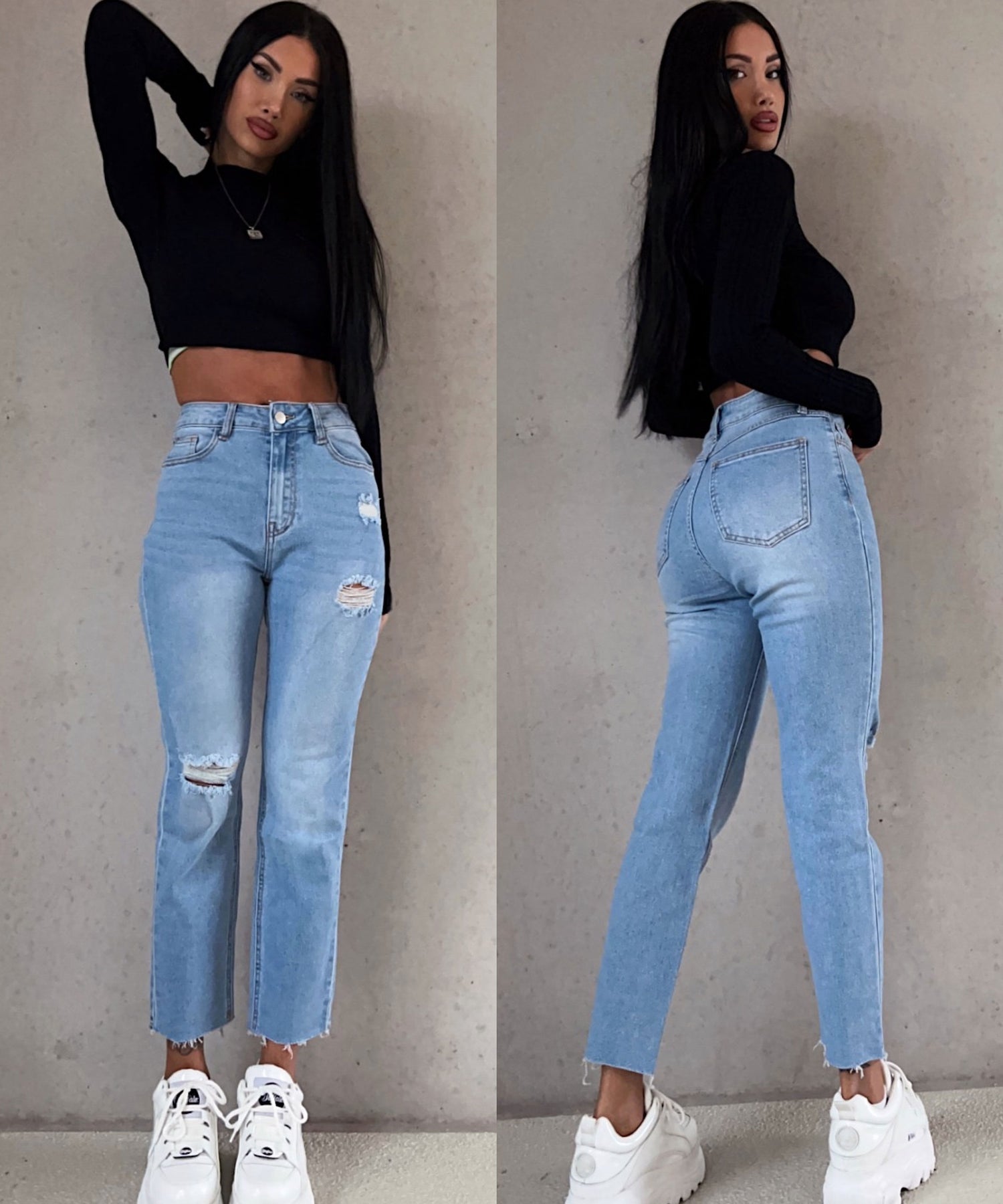 Fällt normal aus und enthält viel Stretch. Daher ist sie super bequem. Unser Model ist 1,65m groß und trägt die Größe S.