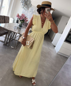 Musselin Kleid aus 100% Baumwolle. Dehnbarer Gummibund passt den Größen XS-L. Model ist 1,65m groß.