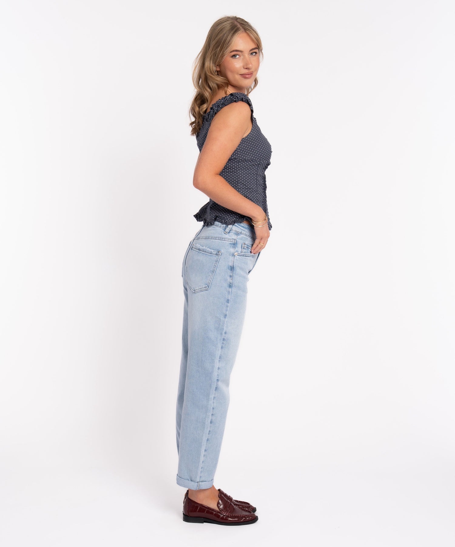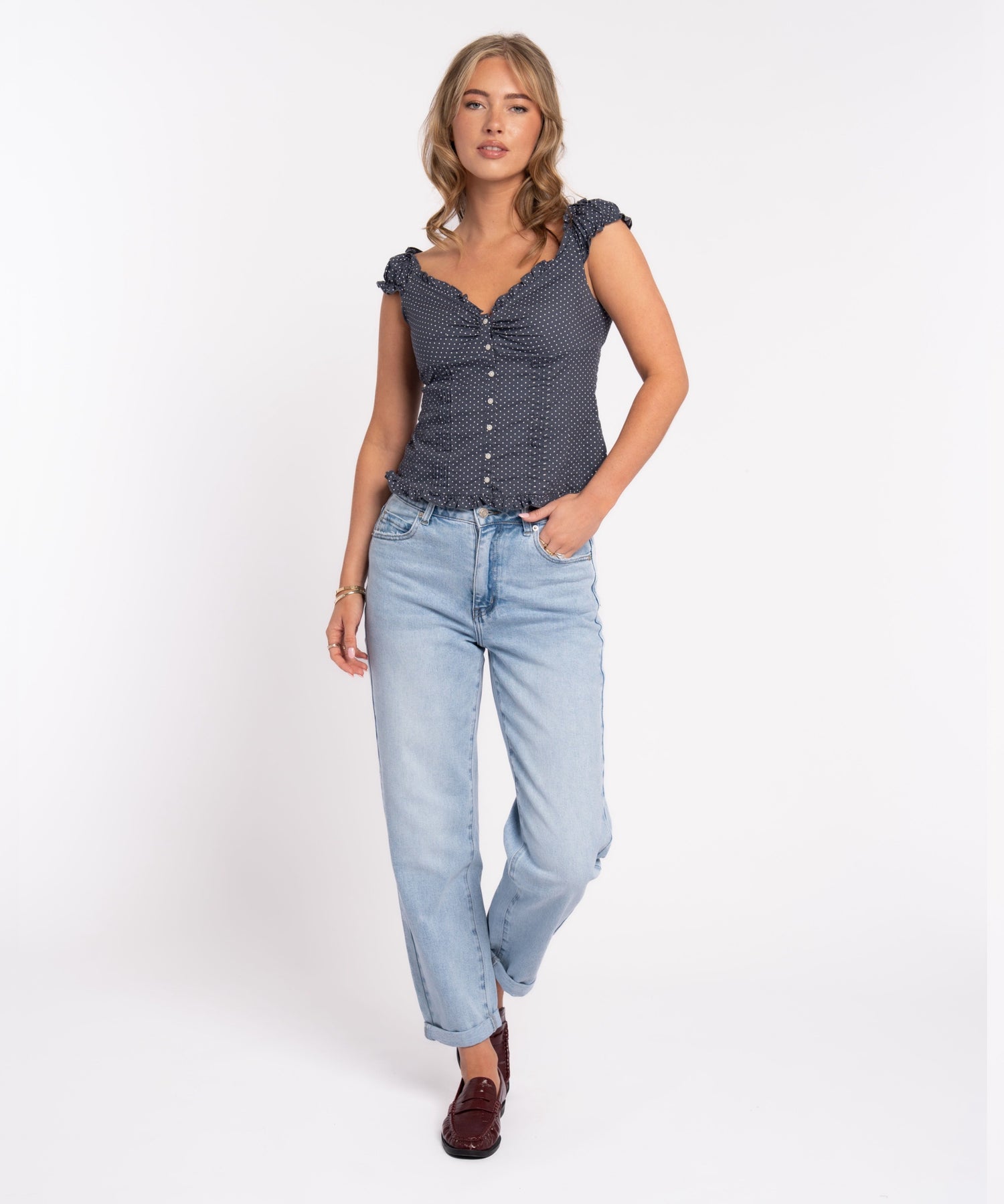 Jeans aus Baumwolle mit Stretch. Fällt normal aus. Model eins ist 1,68m und trägt Größe S.