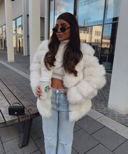 Fällt normal aus. Model ist 1,65m groß und trägt Größe SM. Da es Kunstfell ist und einzeln angebracht wurde verliert sie anfangs etwas an Fell. Einfach mit einer Bürste stark hin und her bürsten dann sollten alle losen Haare entfernt sein.