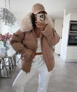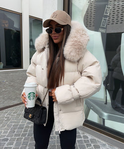Kunstpelz. Fell an der Kapuze abnehmbar.