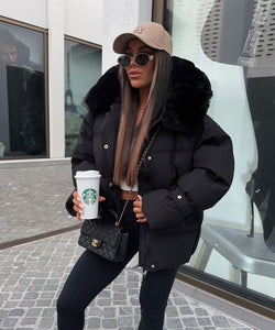 Super warme Winterjacke. Model eins ist 1.69m und trägt SM (ML ist nicht arg viel größer) Fällt normal aus. Natürlich Kunstpelz. Fell an der Kapuze abnehmbar.