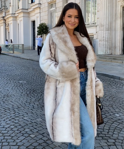 Sehr hochwertiger Pelzmantel. Sieht sehr nach Echtpelz aus ist aber natürlich 100% vegan. Mit Haken zum verschließen.Fällt normal aus. Model ist 1,69m und trägt Größe SM.