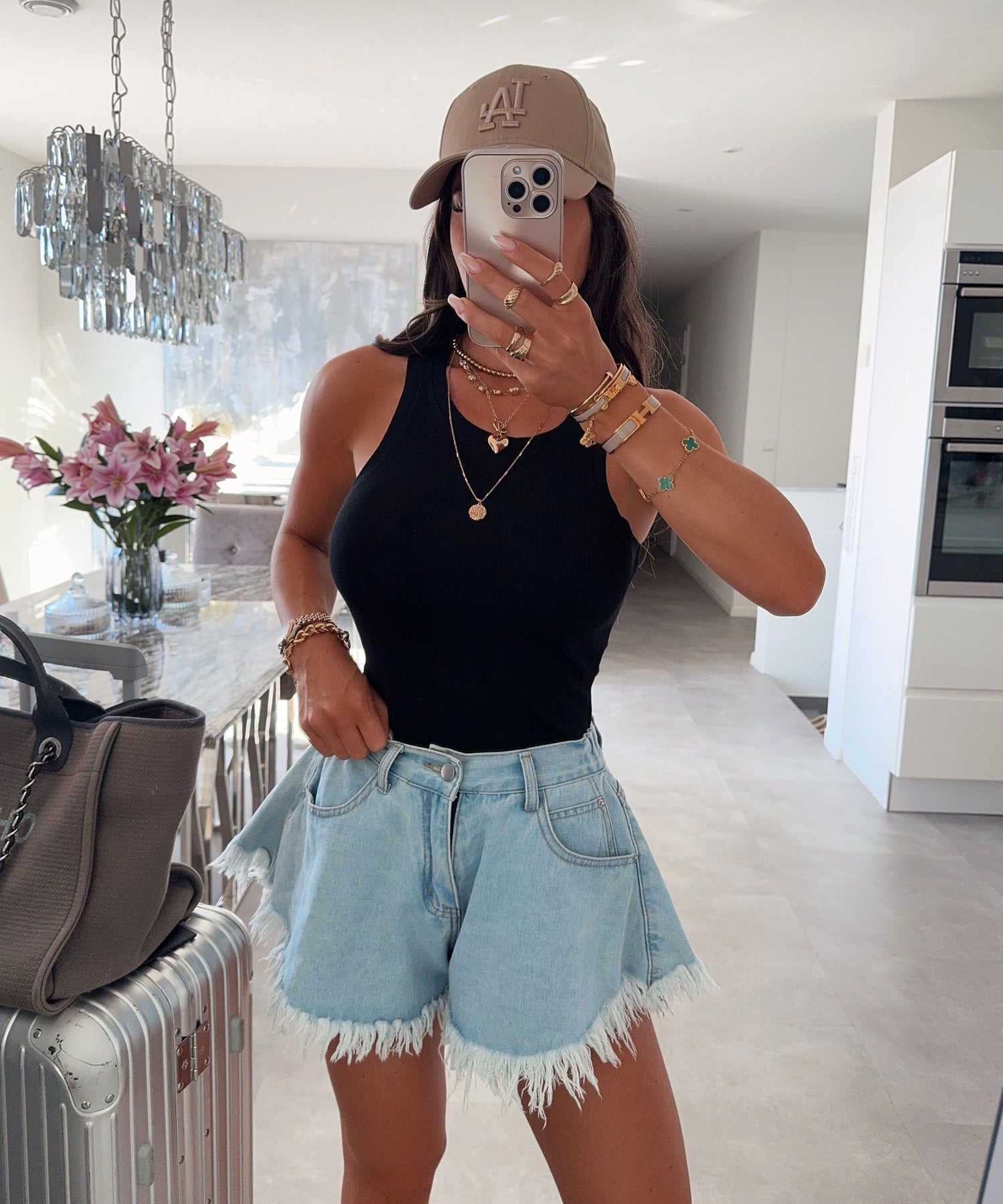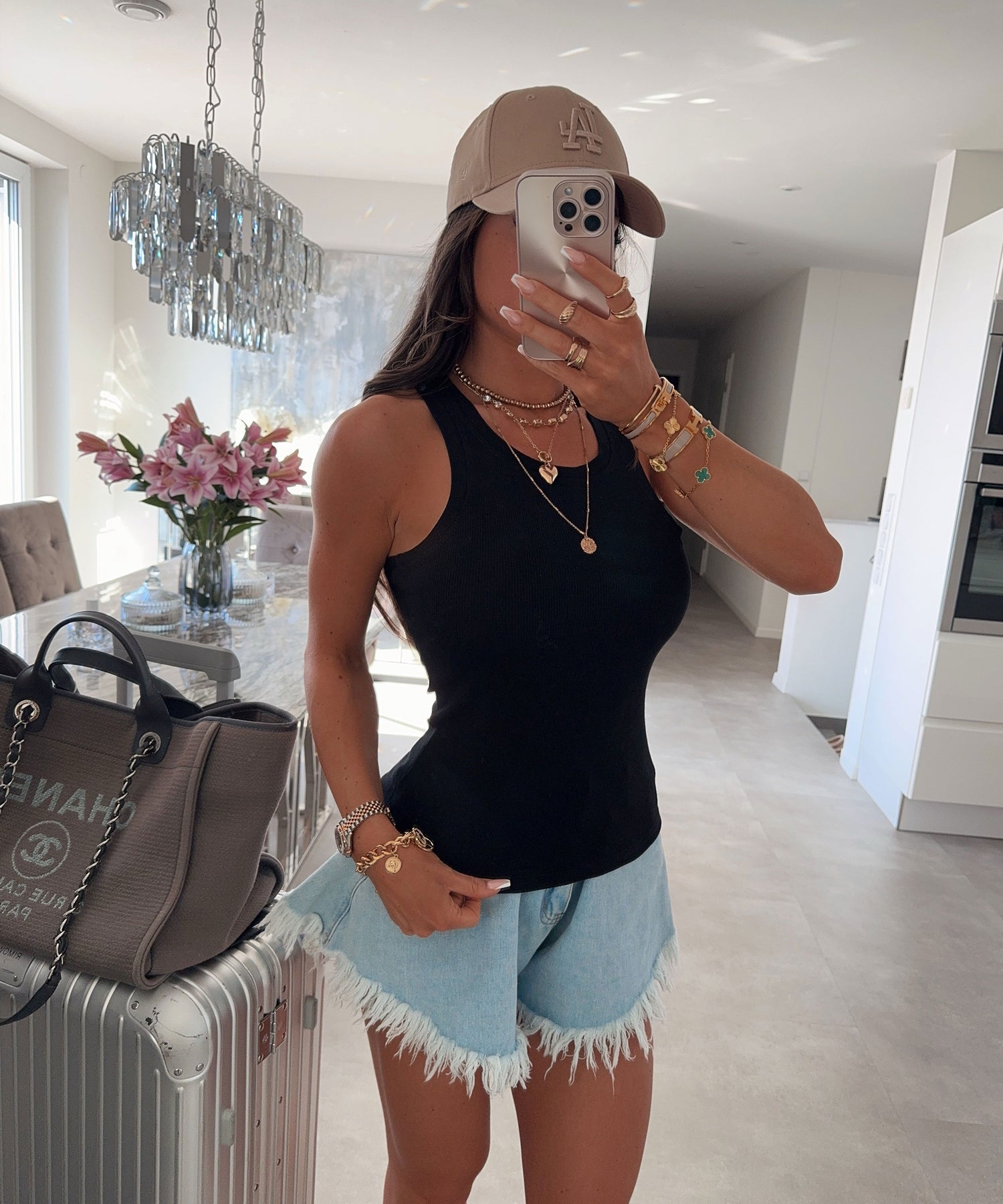 Top aus Baumwolle. Model ist 1,65m groß und trägt Größe SM.