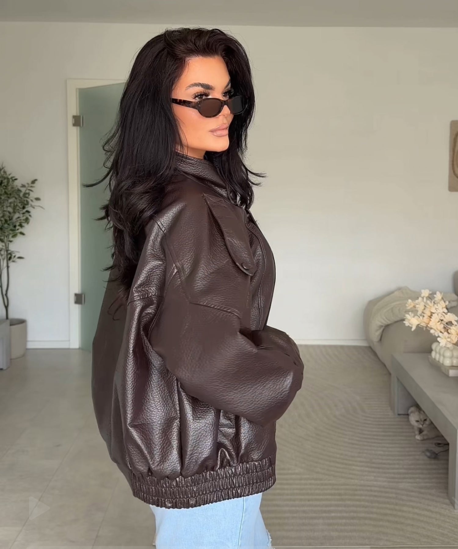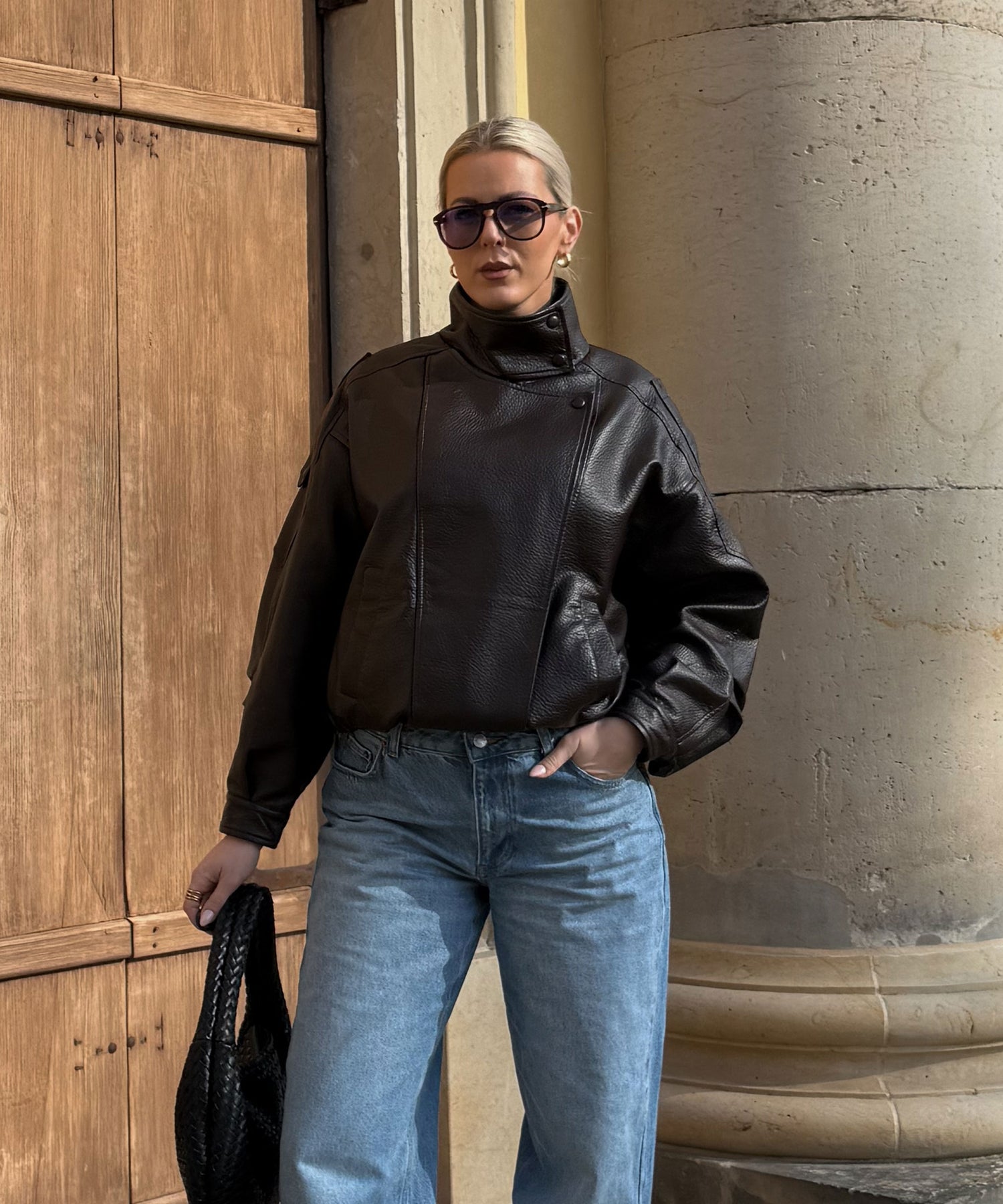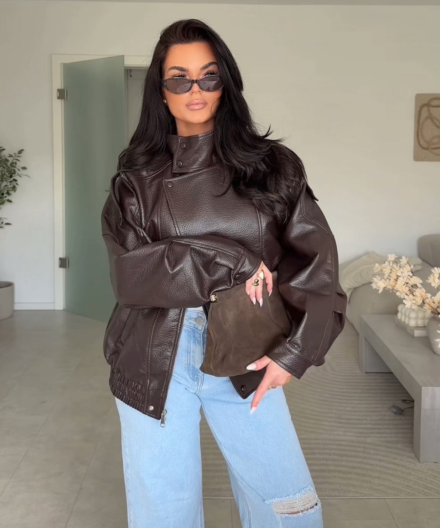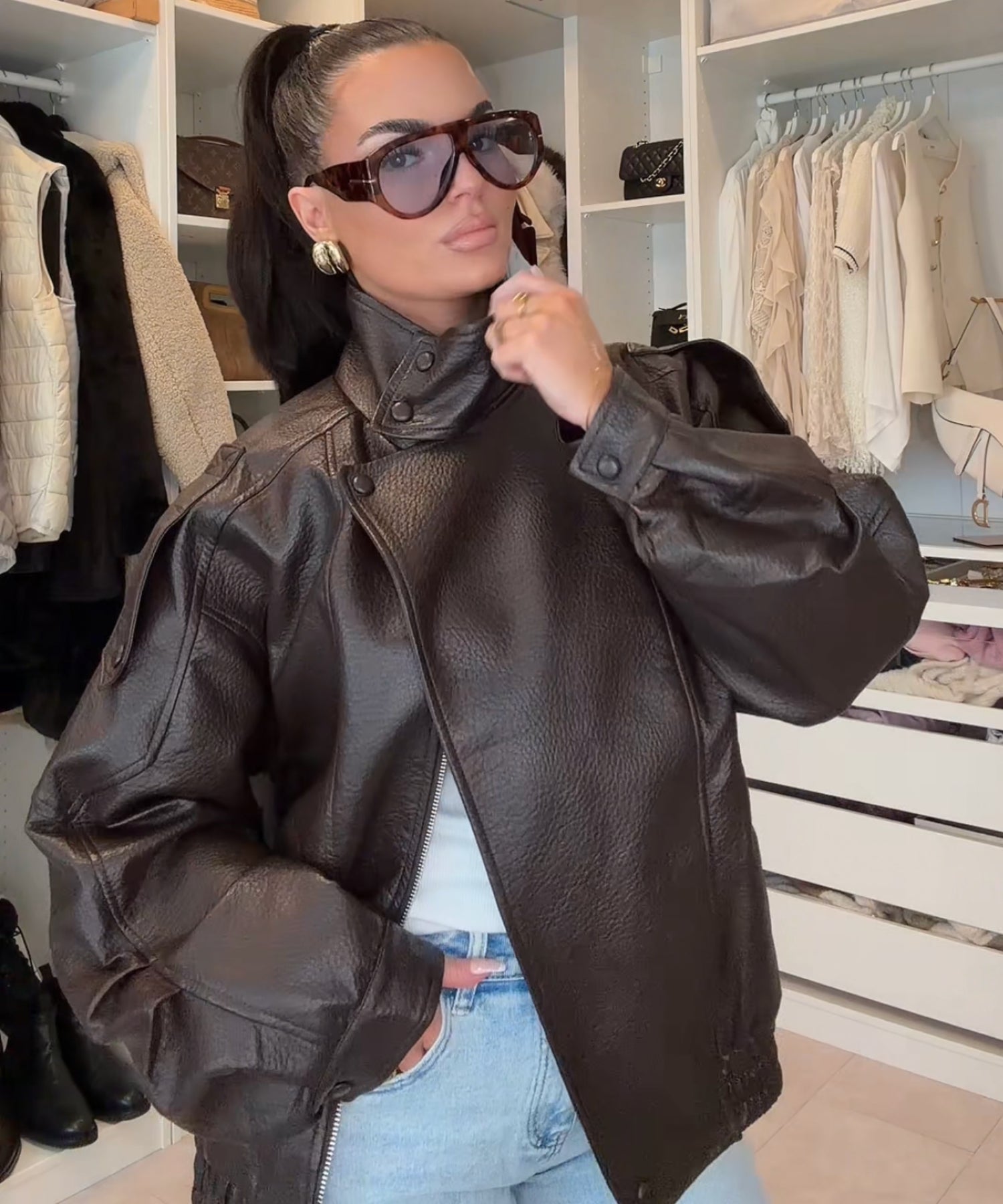 Oversize geschnittene Lederjacke mit super weichem veganem Leder. Model eins ist 1,65m und trägt Größe SM. Model zwei (blond) ist 1,76m groß und trägt Größe ML.
