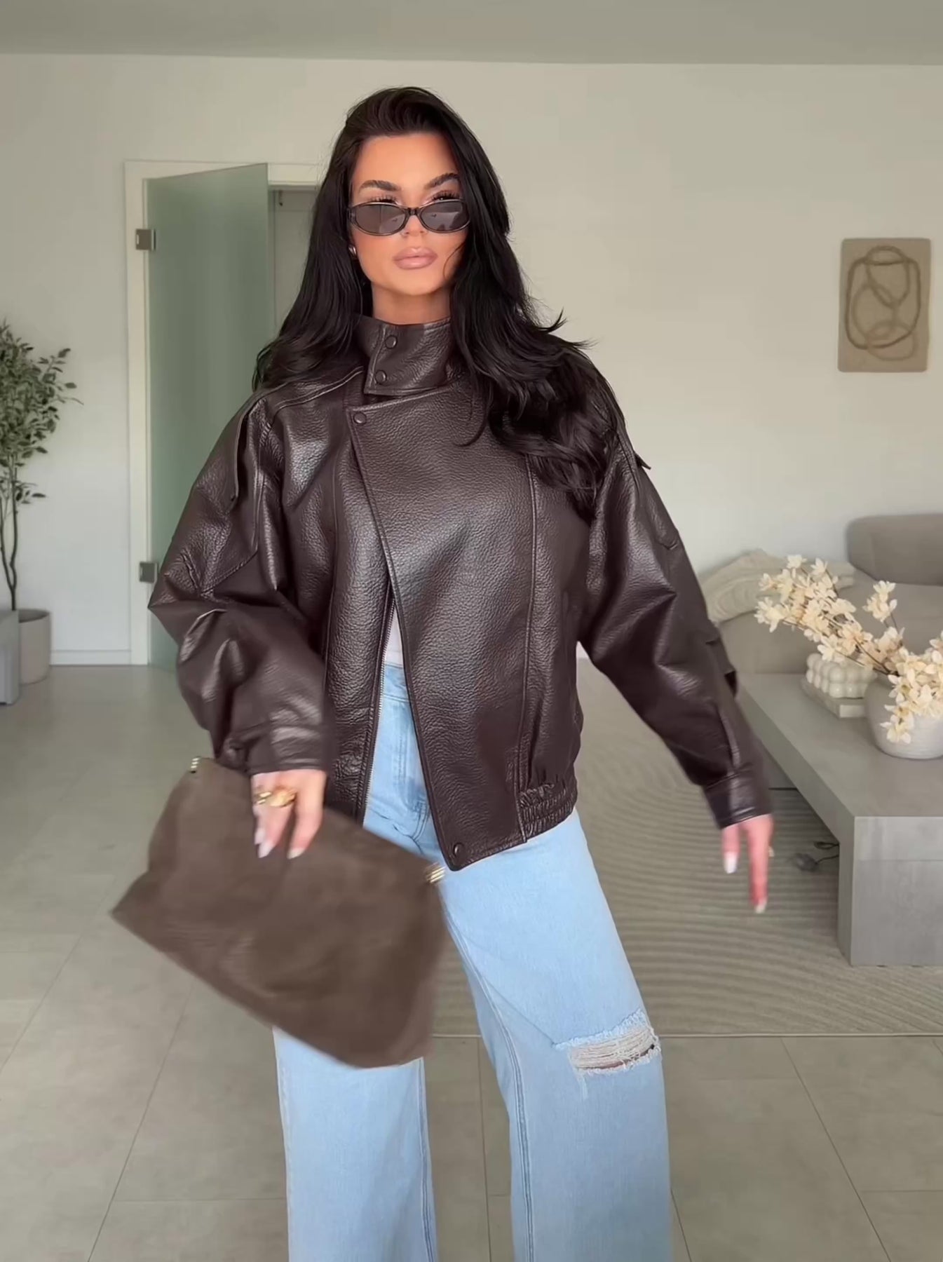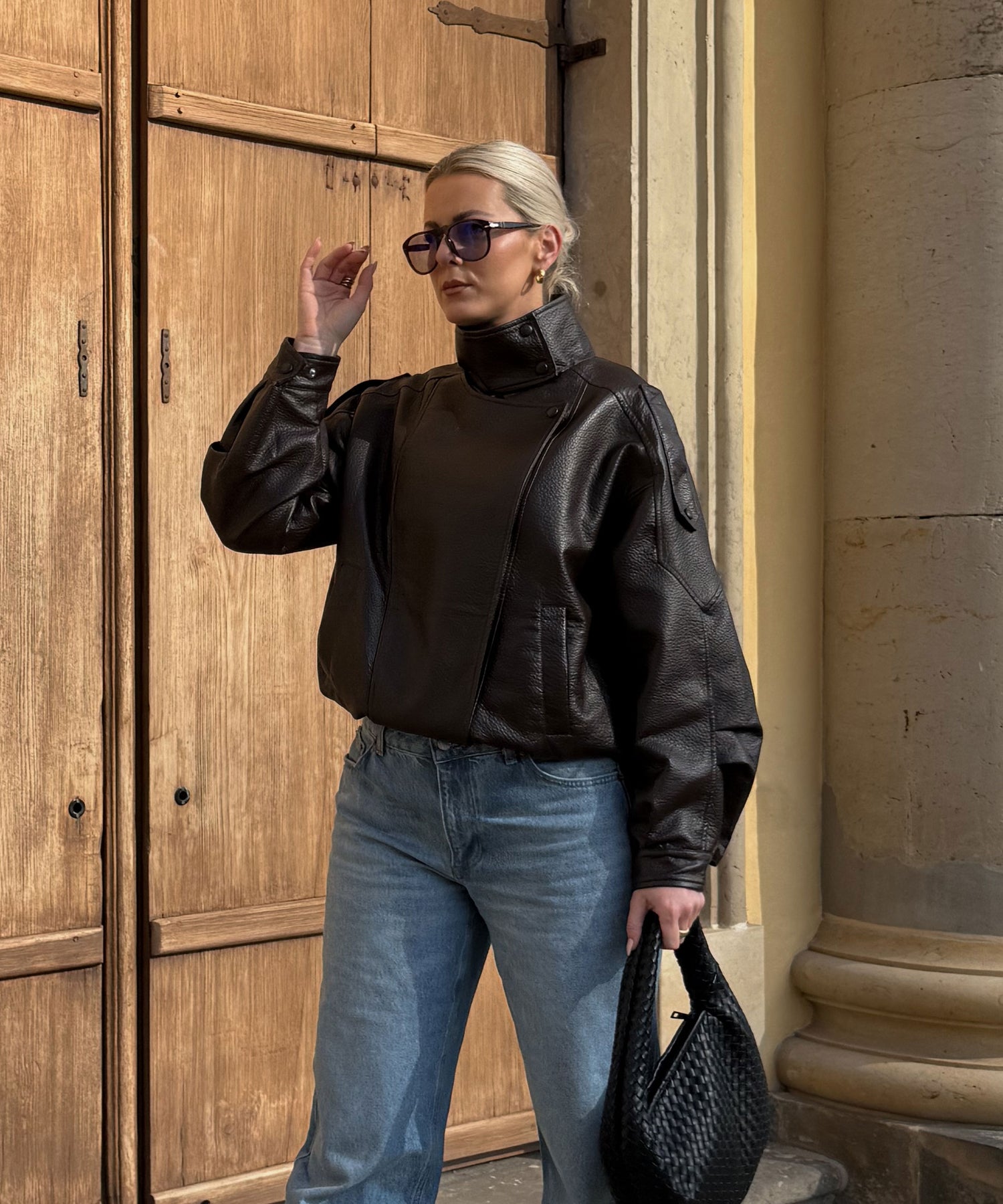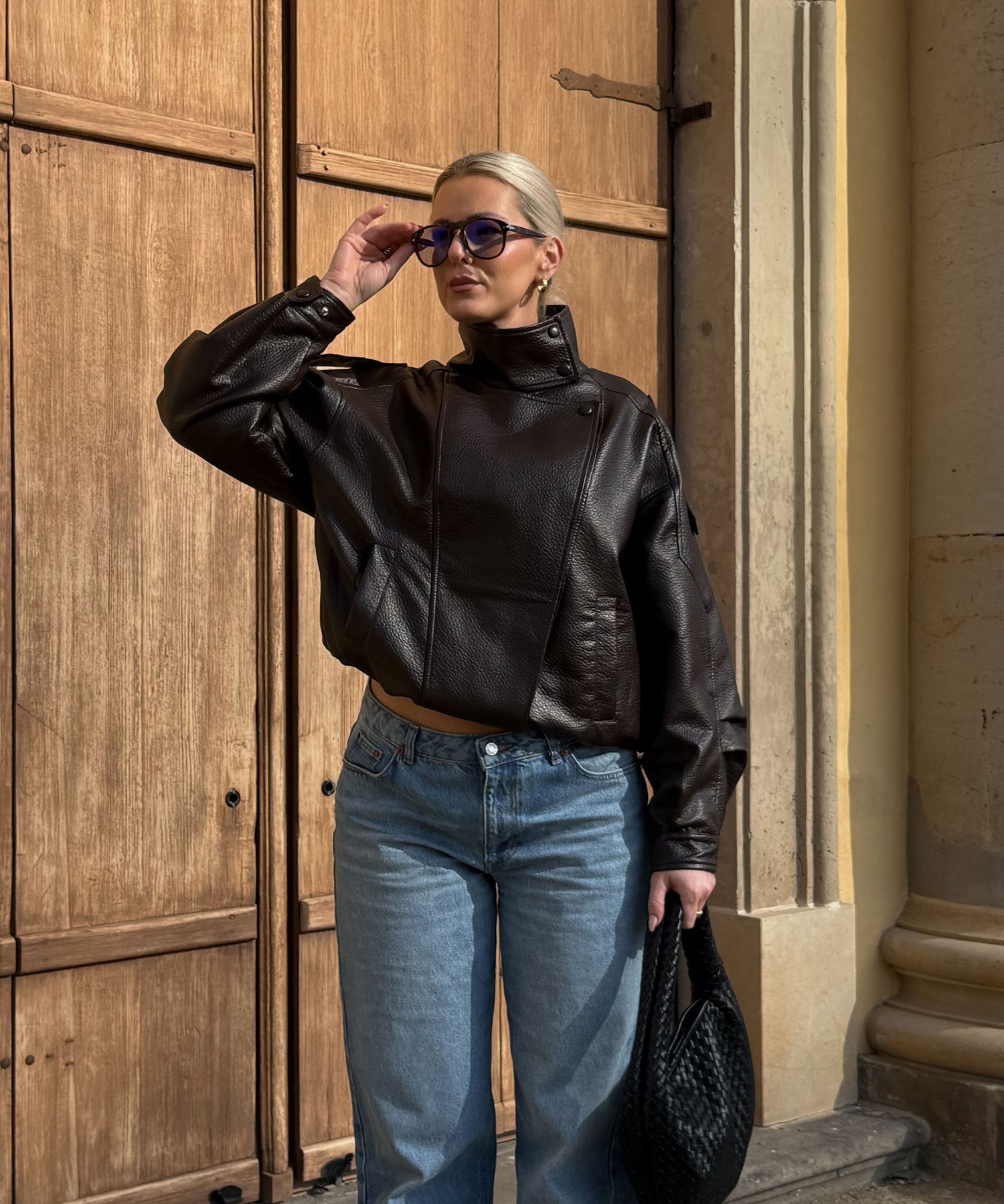 Oversize geschnittene Lederjacke mit super weichem veganem Leder. Model eins ist 1,65m und trägt Größe SM. Model zwei (blond) ist 1,76m groß und trägt Größe ML.