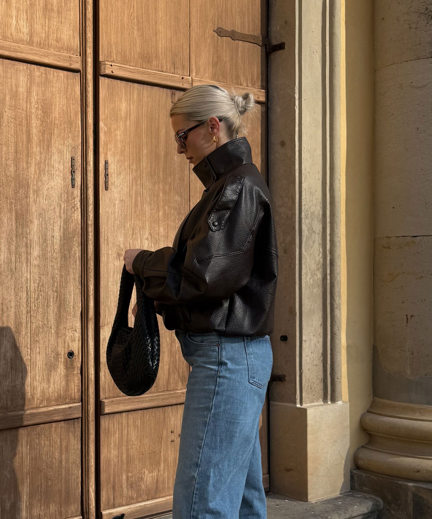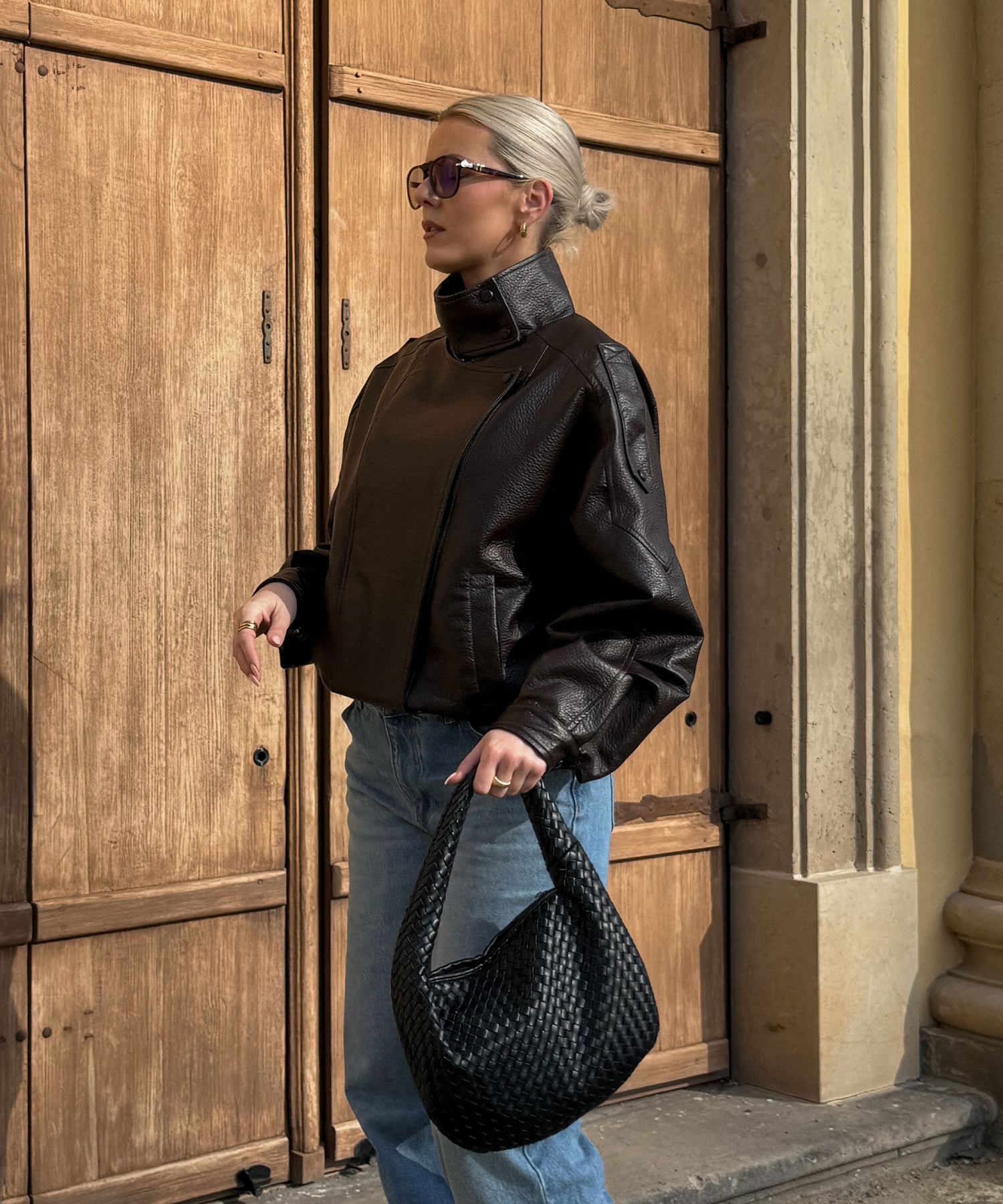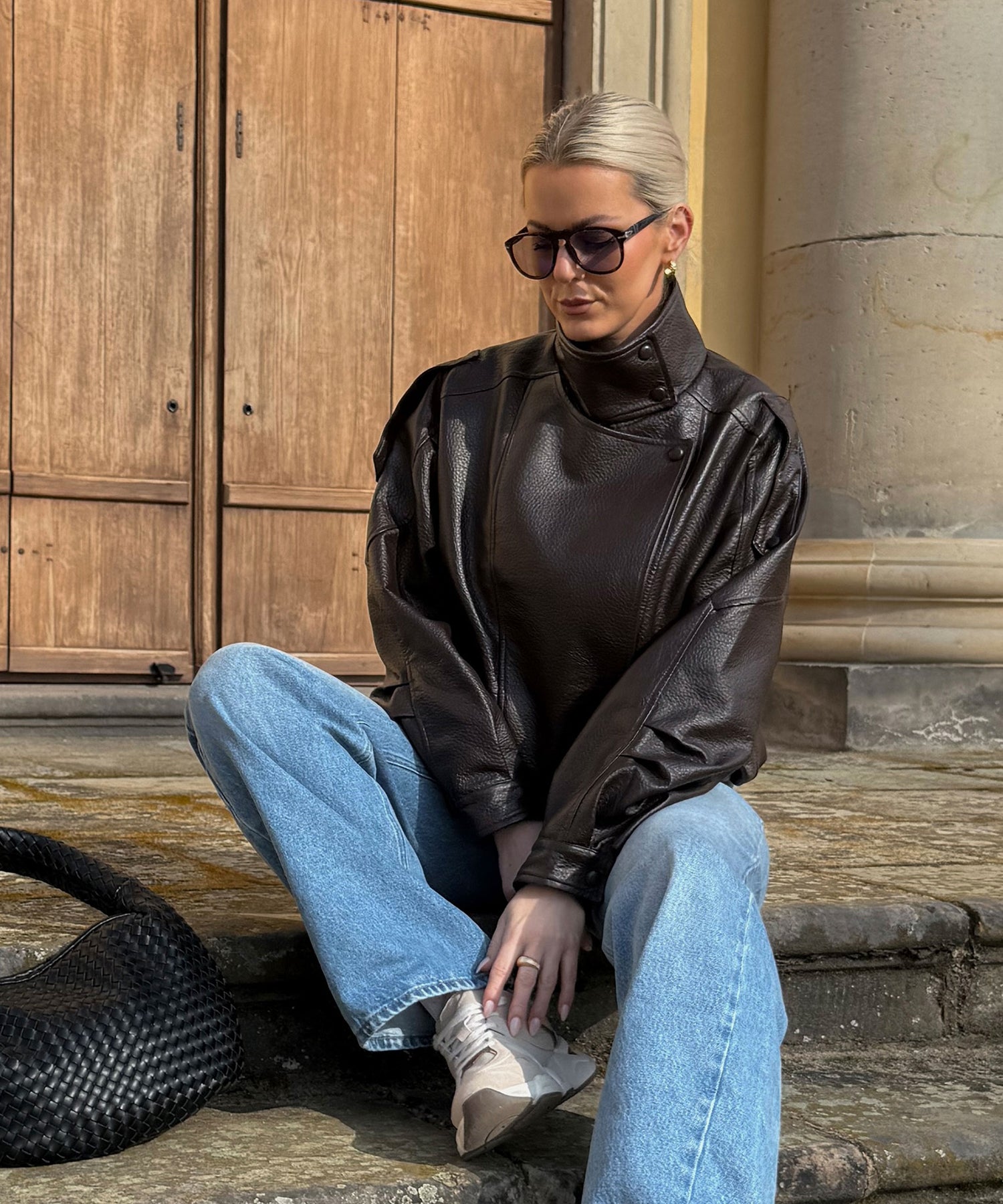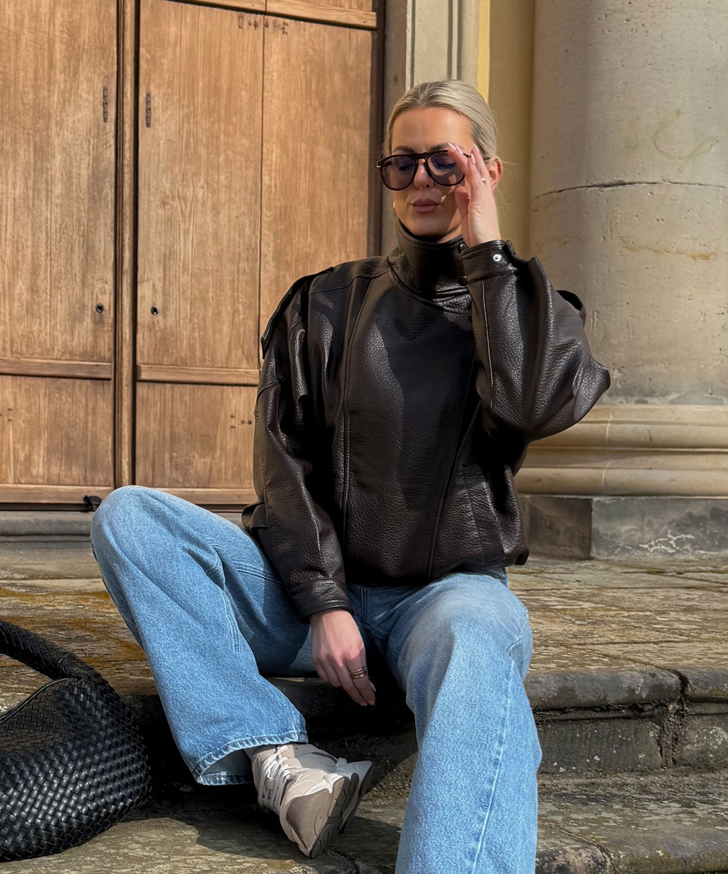 Oversize geschnittene Lederjacke mit super weichem veganem Leder. Model eins ist 1,65m und trägt Größe SM. Model zwei (blond) ist 1,76m groß und trägt Größe ML.