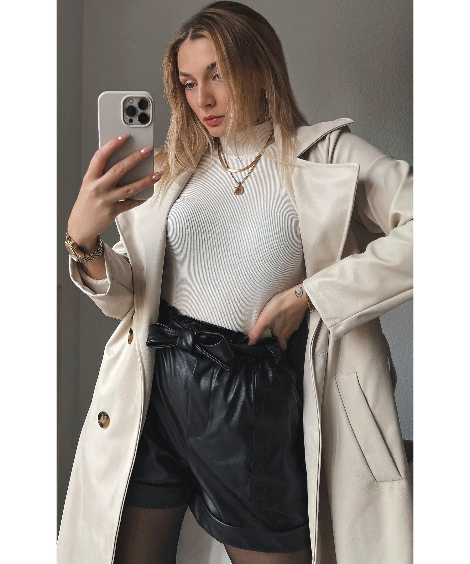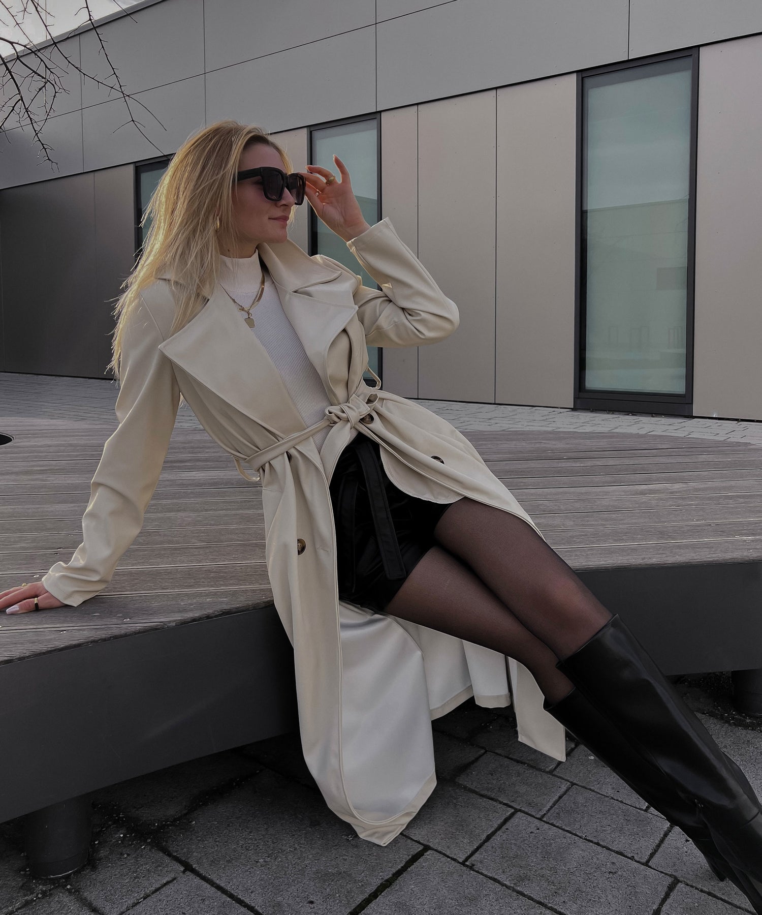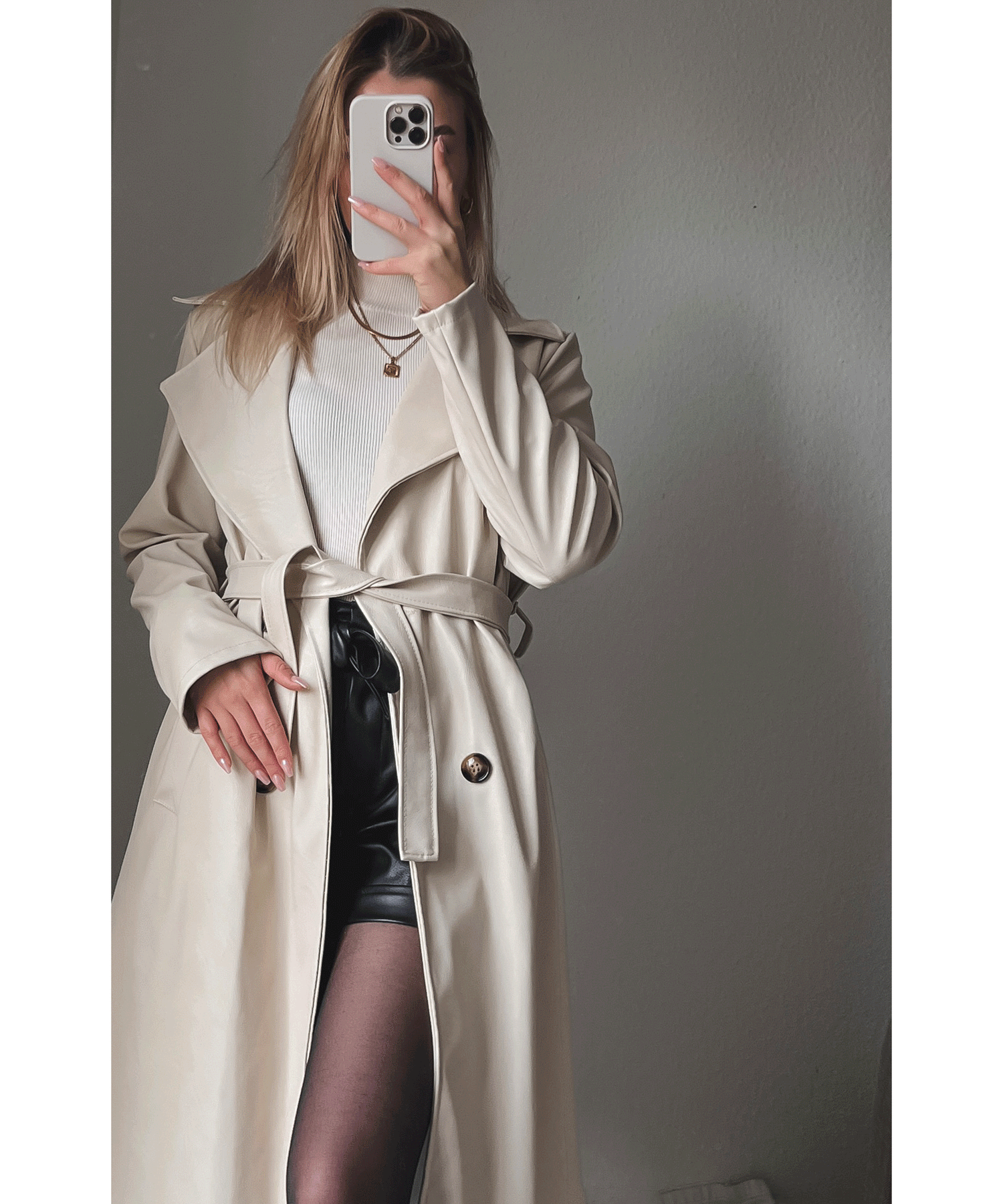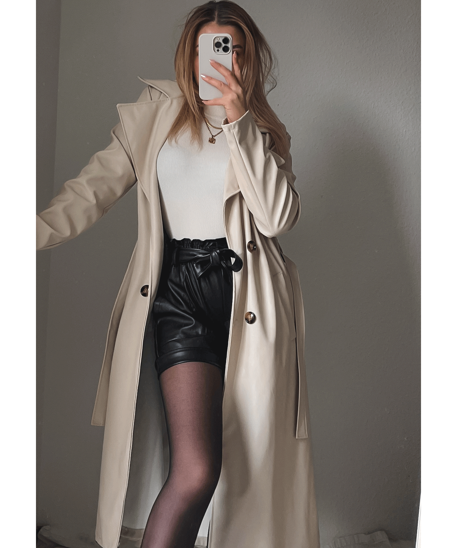 Manteau léger en similicuir parfait pour l'automne. Taille unique pour XS-XL. Le mannequin mesure 1,65 m et porte une taille classique S (36).