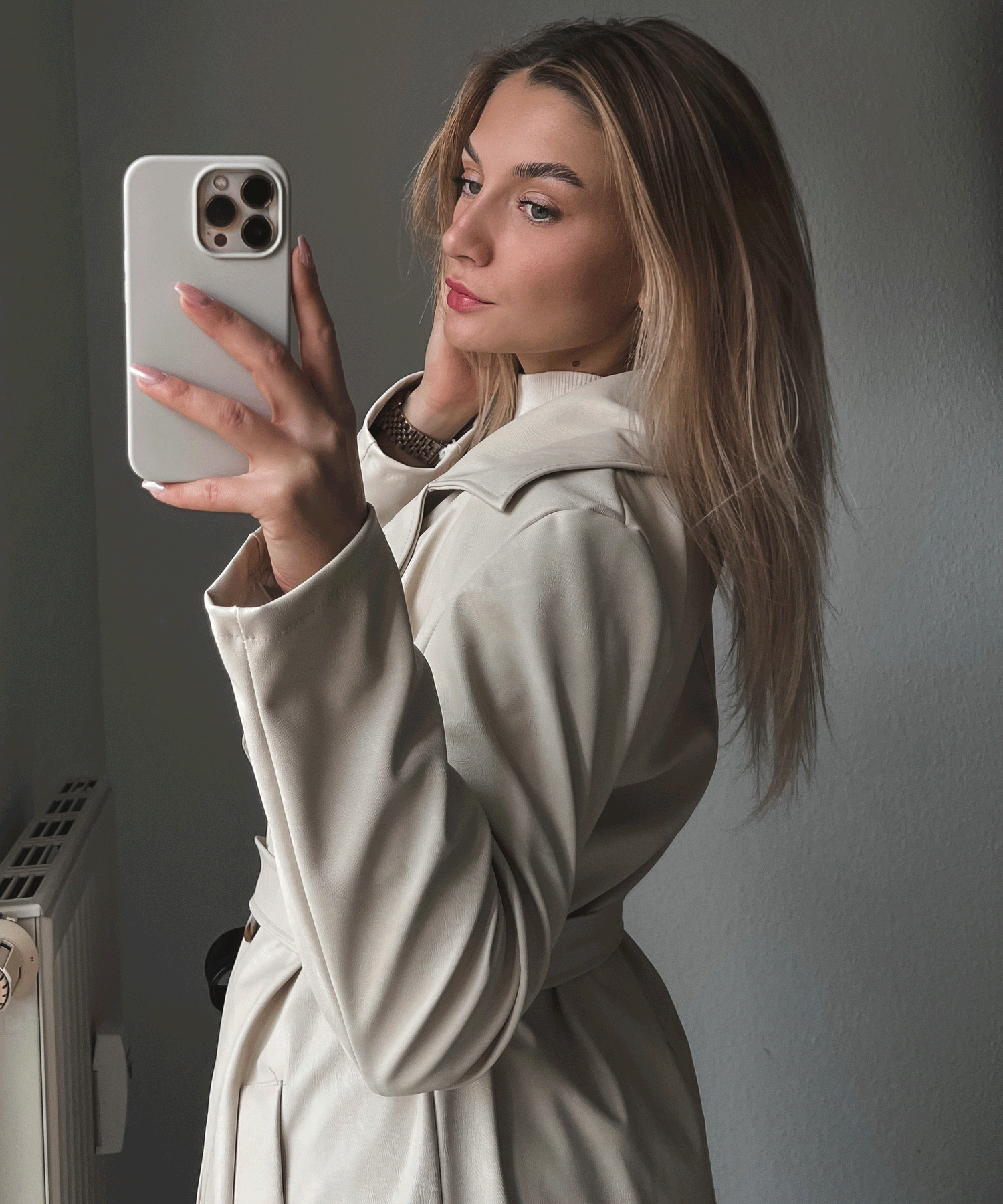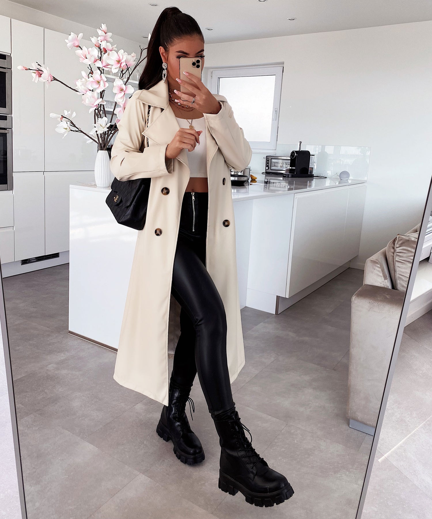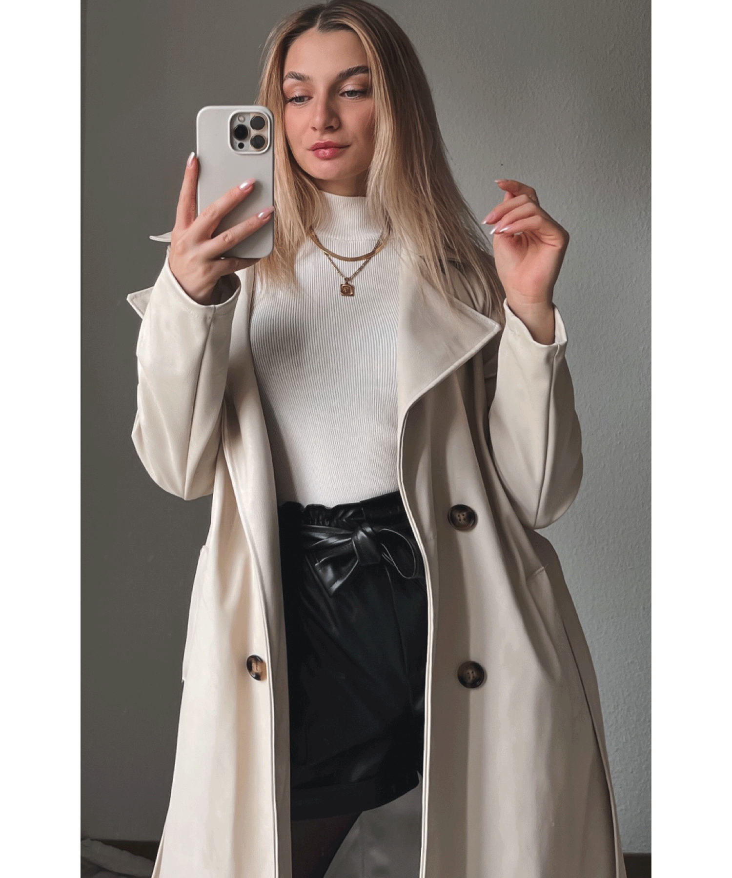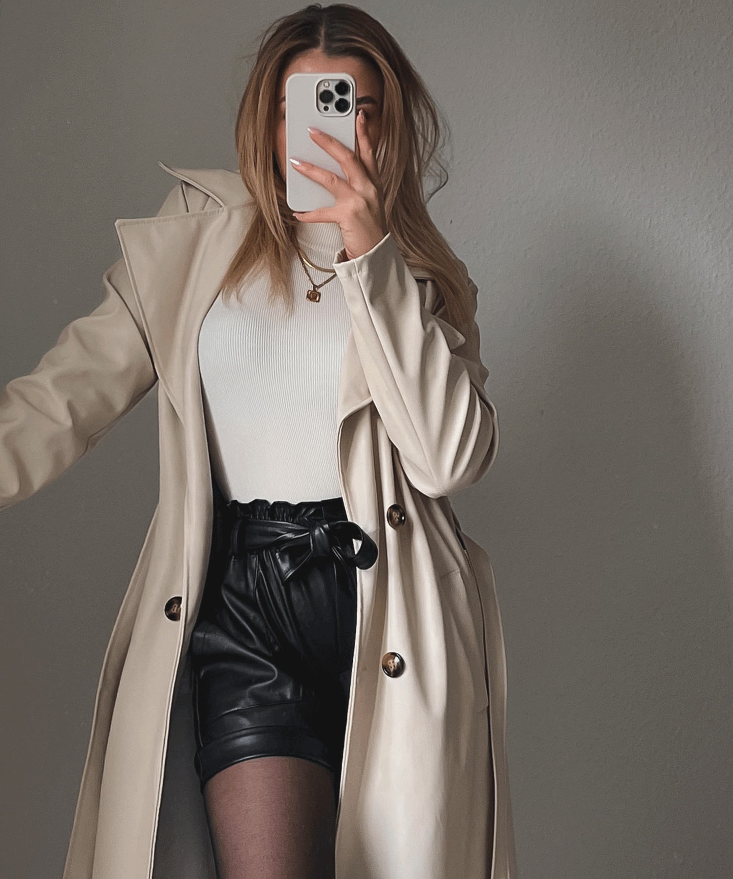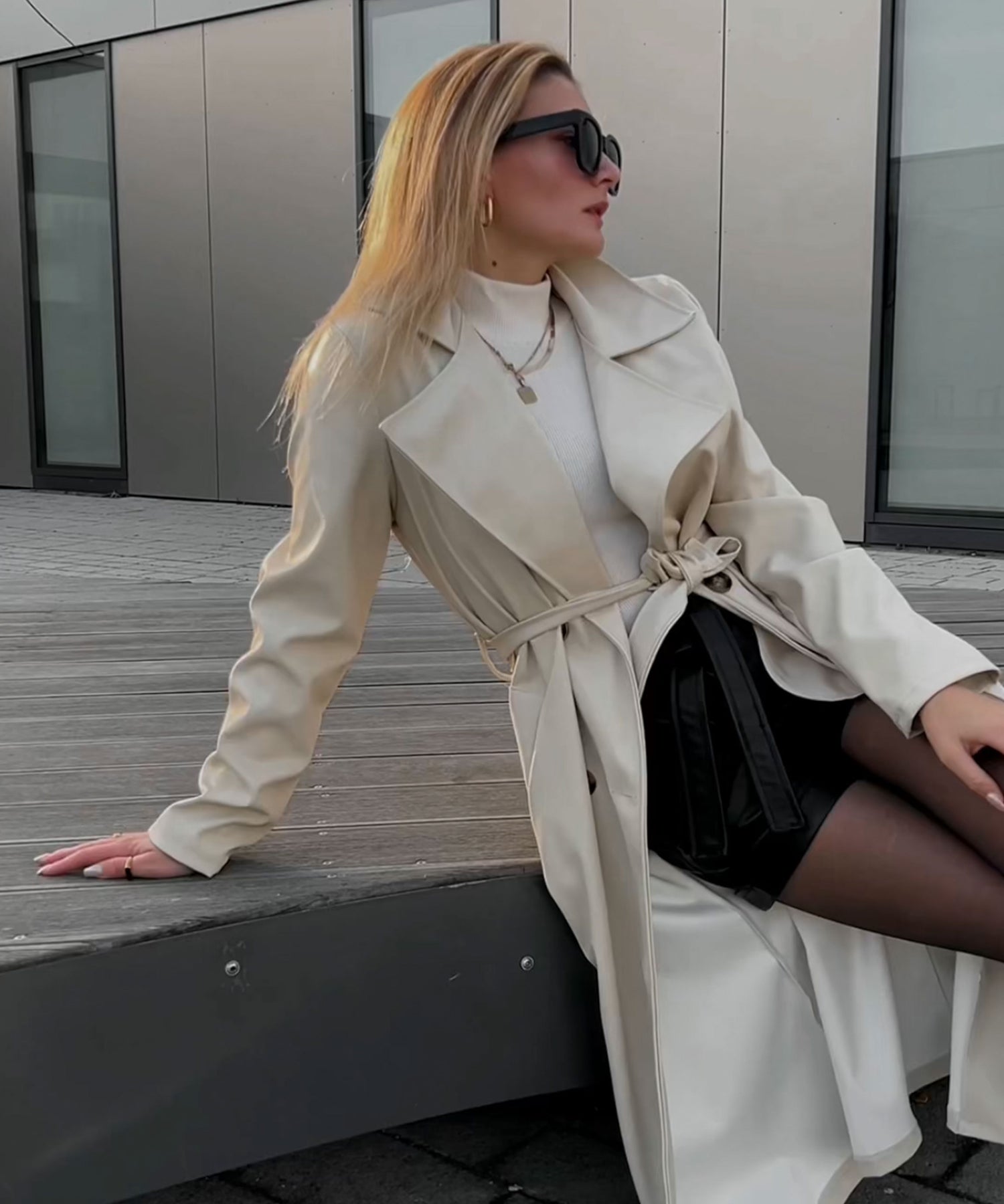 Manteau léger en similicuir parfait pour l'automne. Taille unique pour XS-XL. Le mannequin mesure 1,65 m et porte une taille classique S (36).