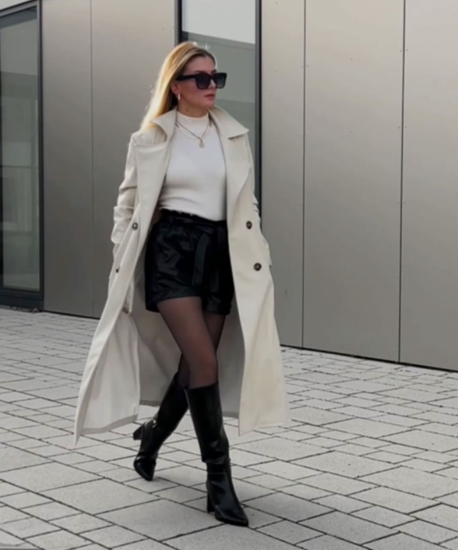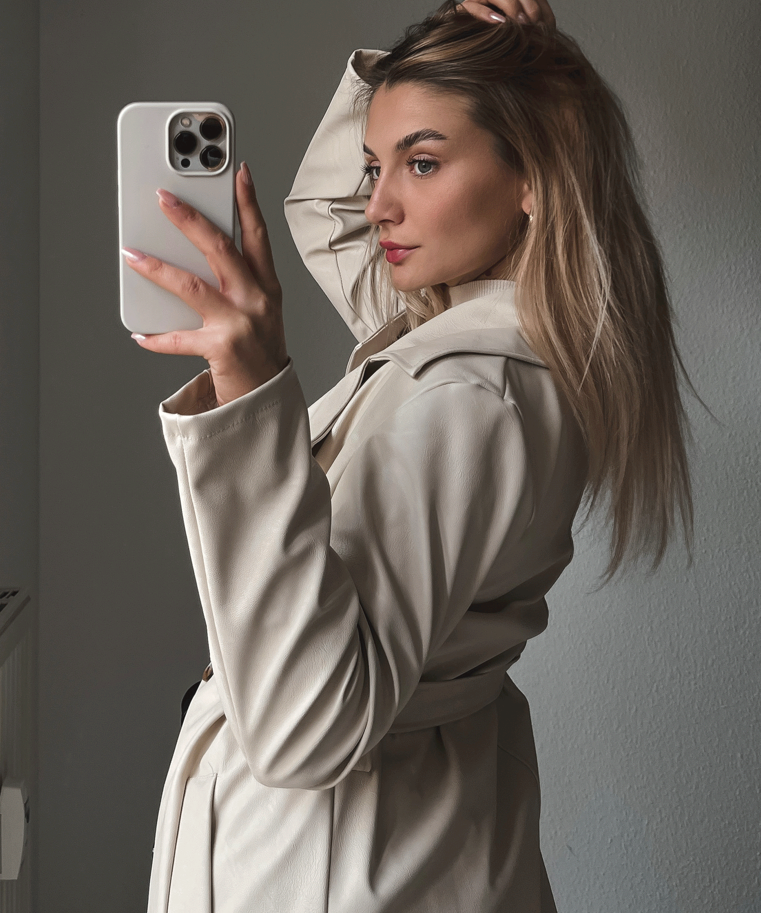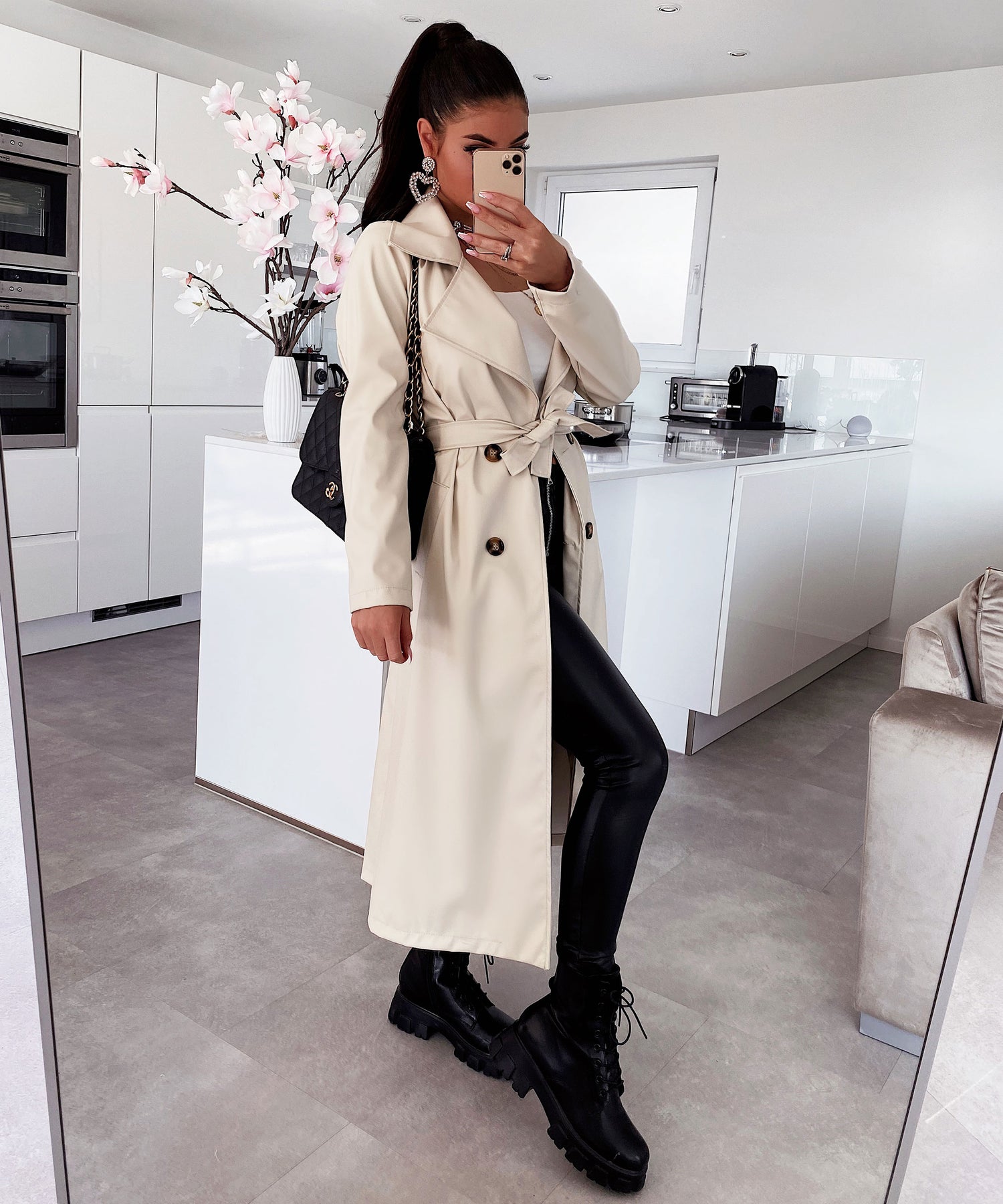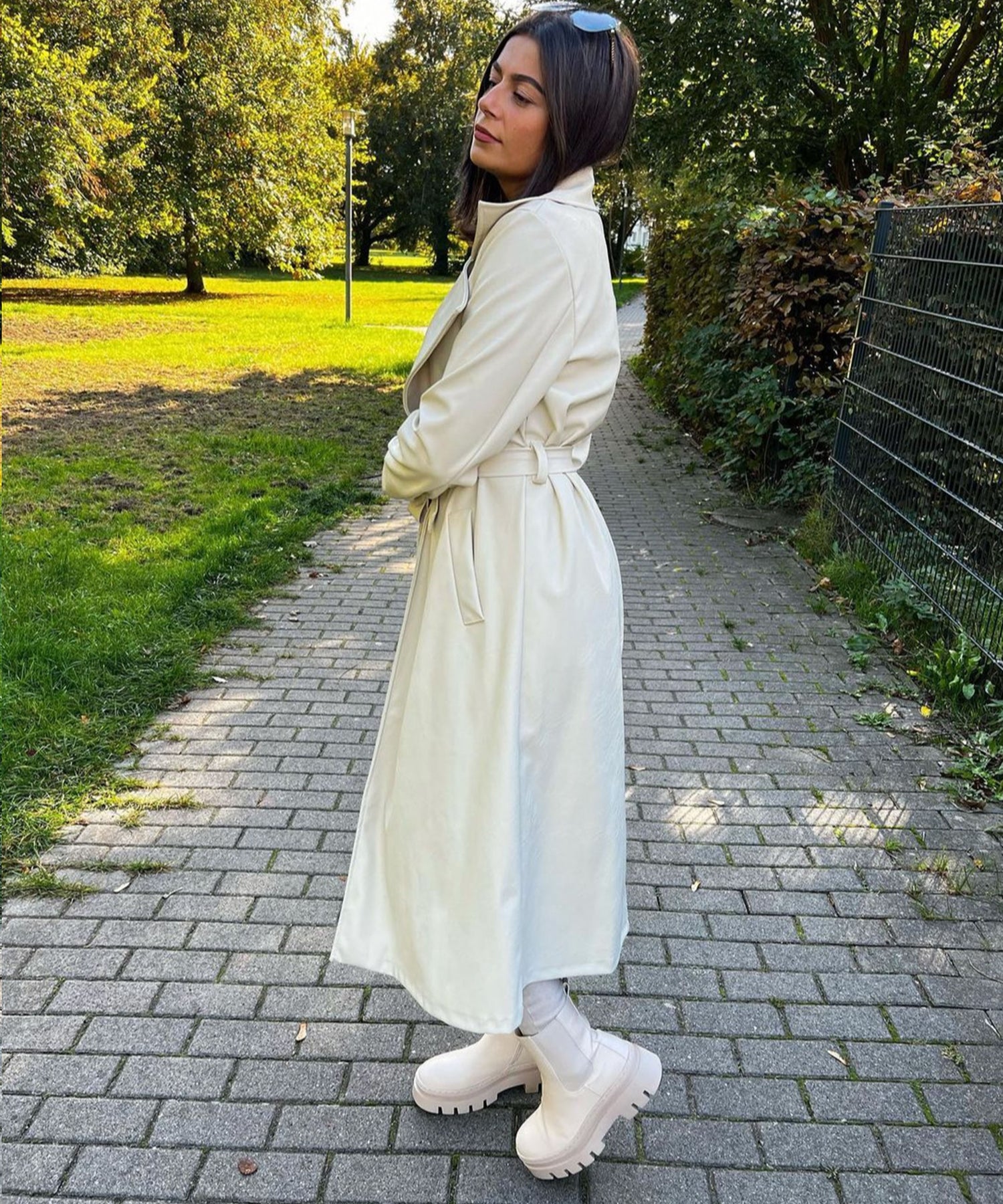 Manteau léger en similicuir parfait pour l'automne. Taille unique pour XS-XL. Le mannequin mesure 1,65 m et porte une taille classique S (36).