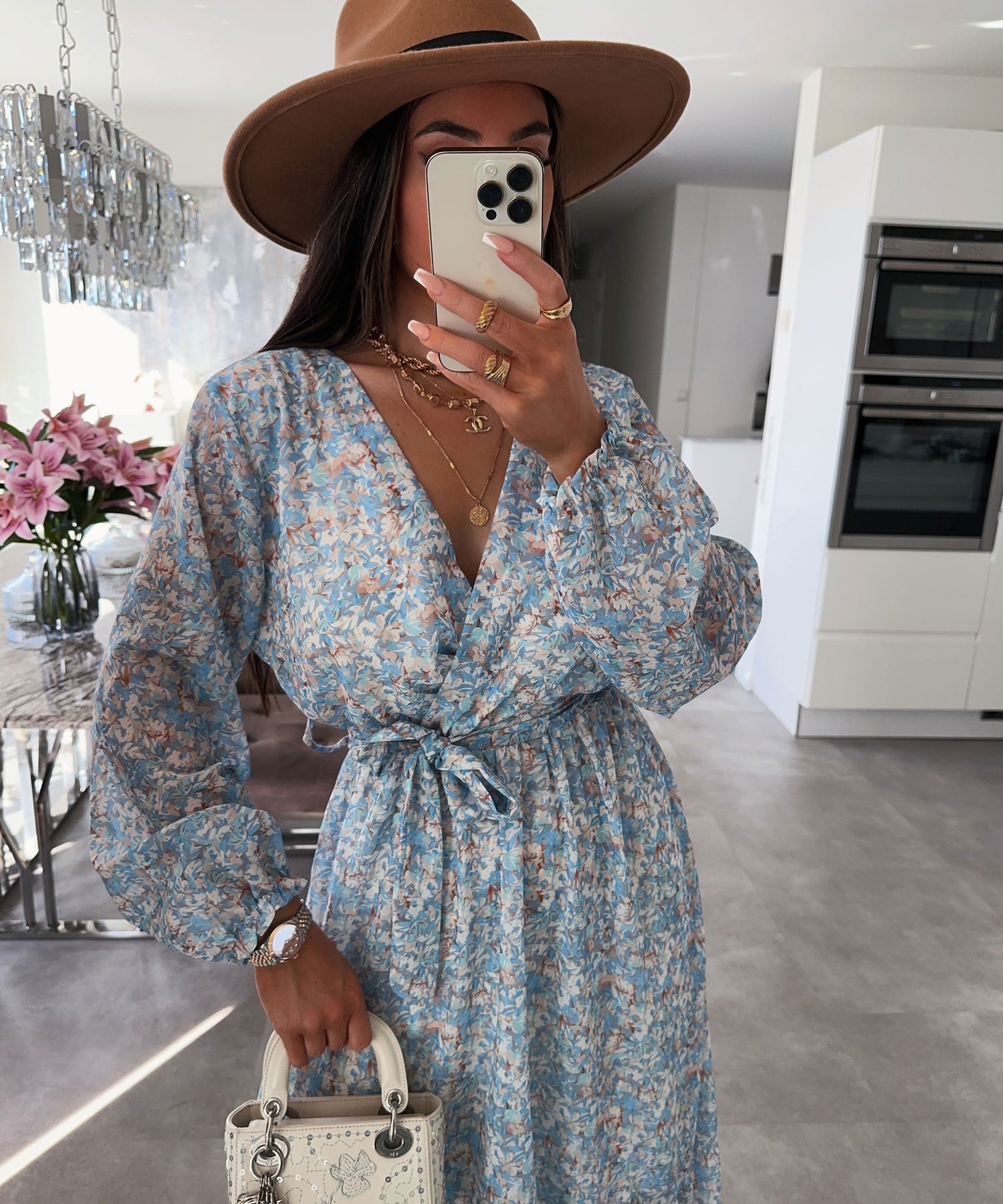 Super schönes Maxi Kleid mit Blumenmuster und Bindegürtel zum Taillieren. Model ist 1,65m groß. Gesamtlänge: ca. 127cm