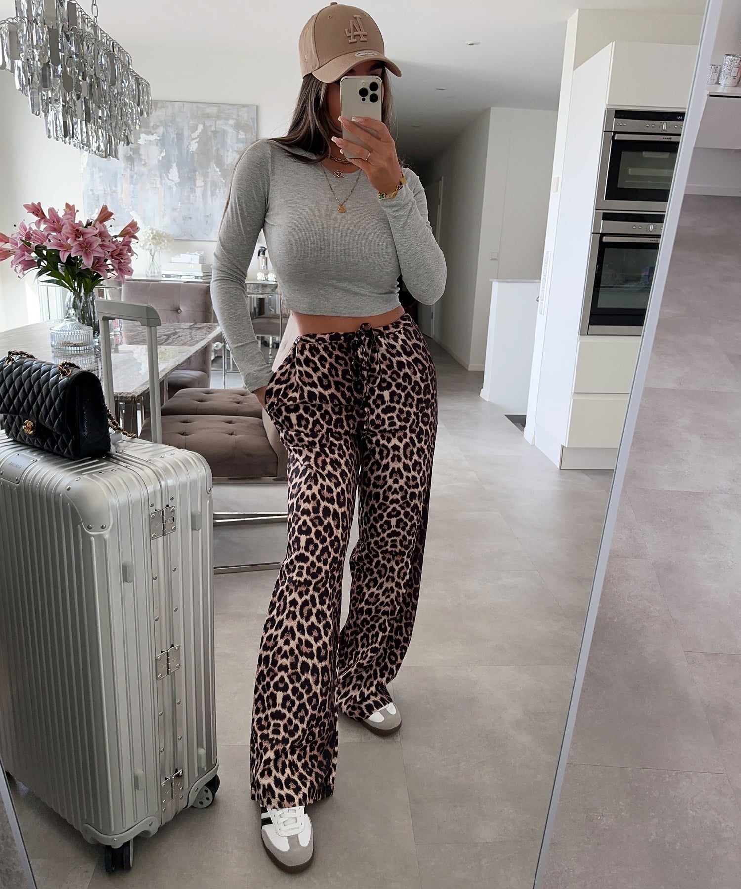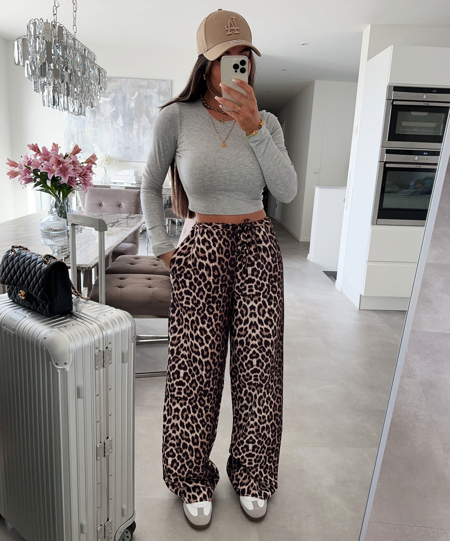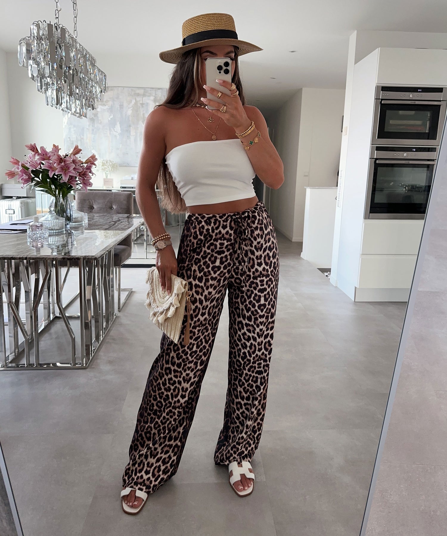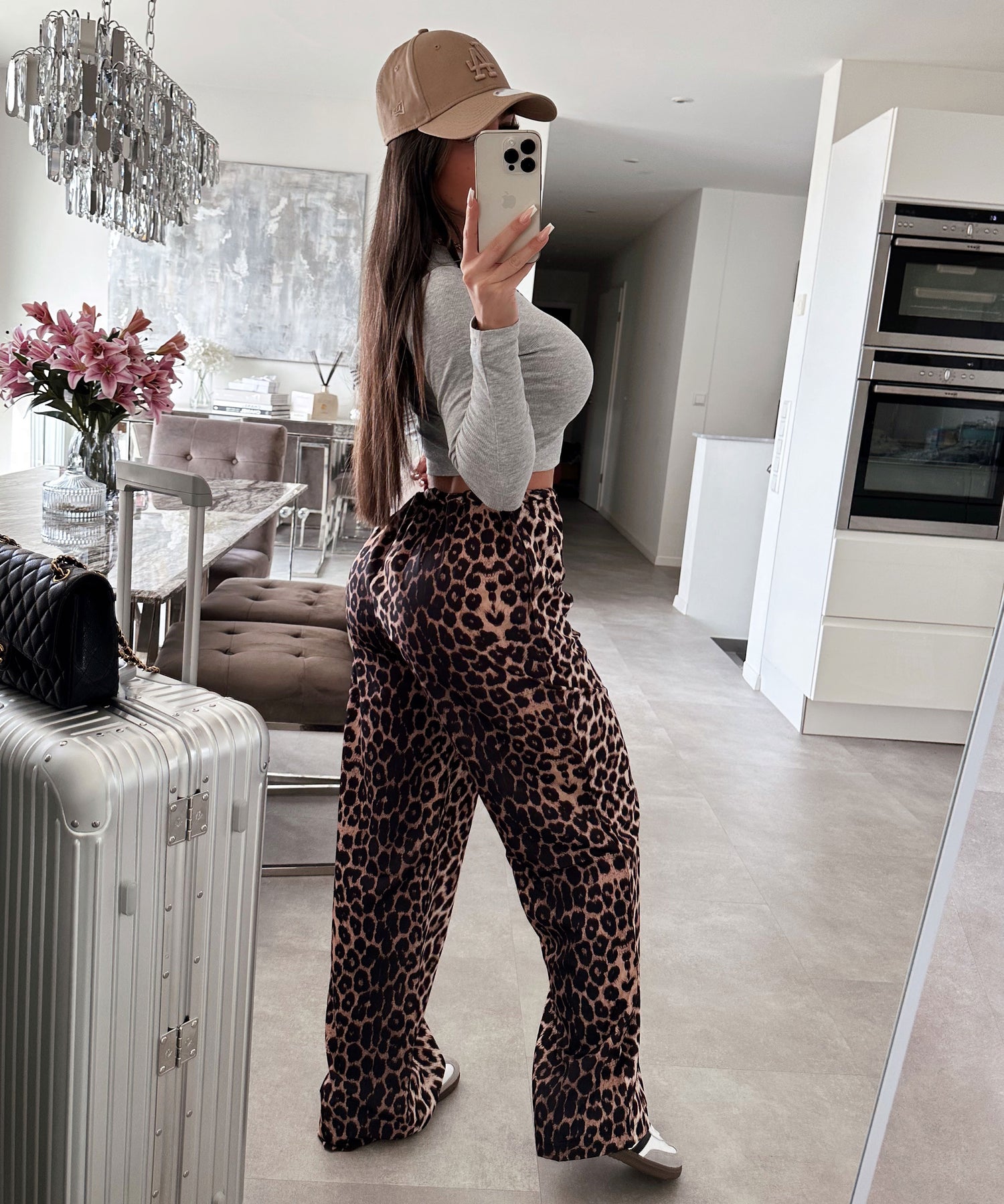 Wunderschöne Stoffhose mit Leomuster. Mit verstellbarem Bund. Model ist 1,65m groß und trägt Größe SM.