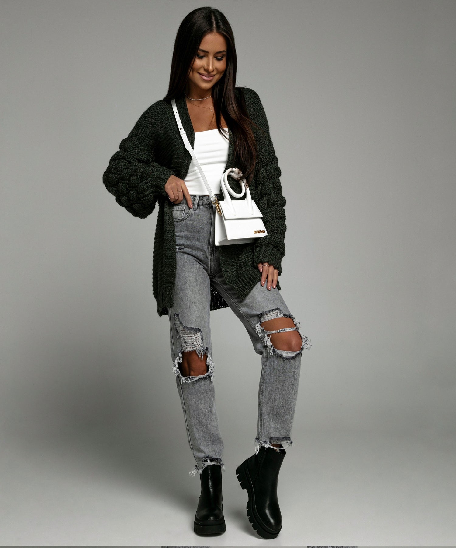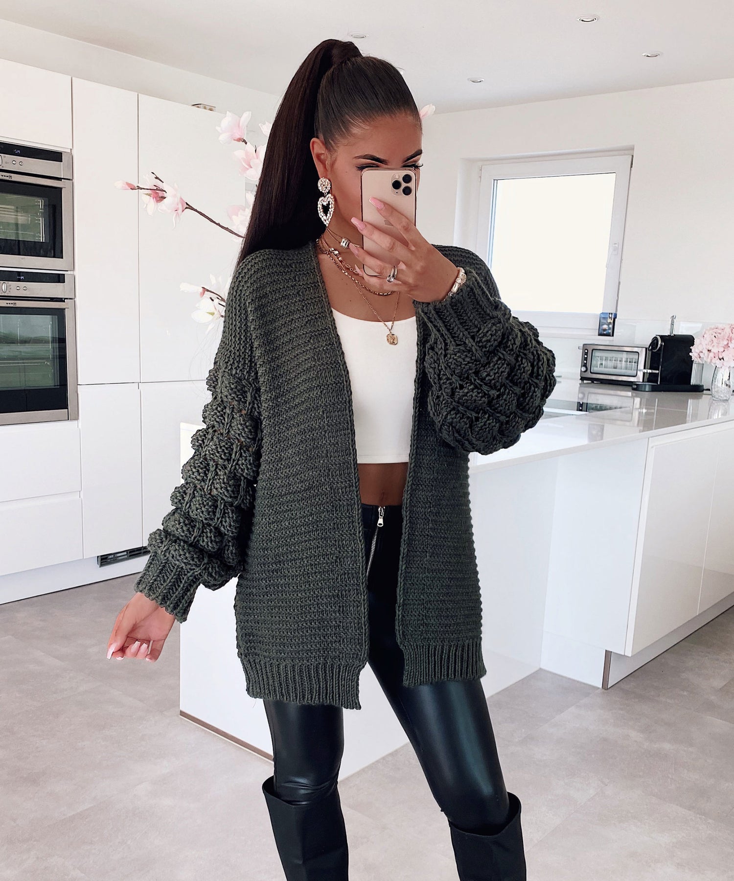 Soft knit jacket. Model one is 1.69m. Model two is 1.65m. One size fits XS-XL. Length about 78cm